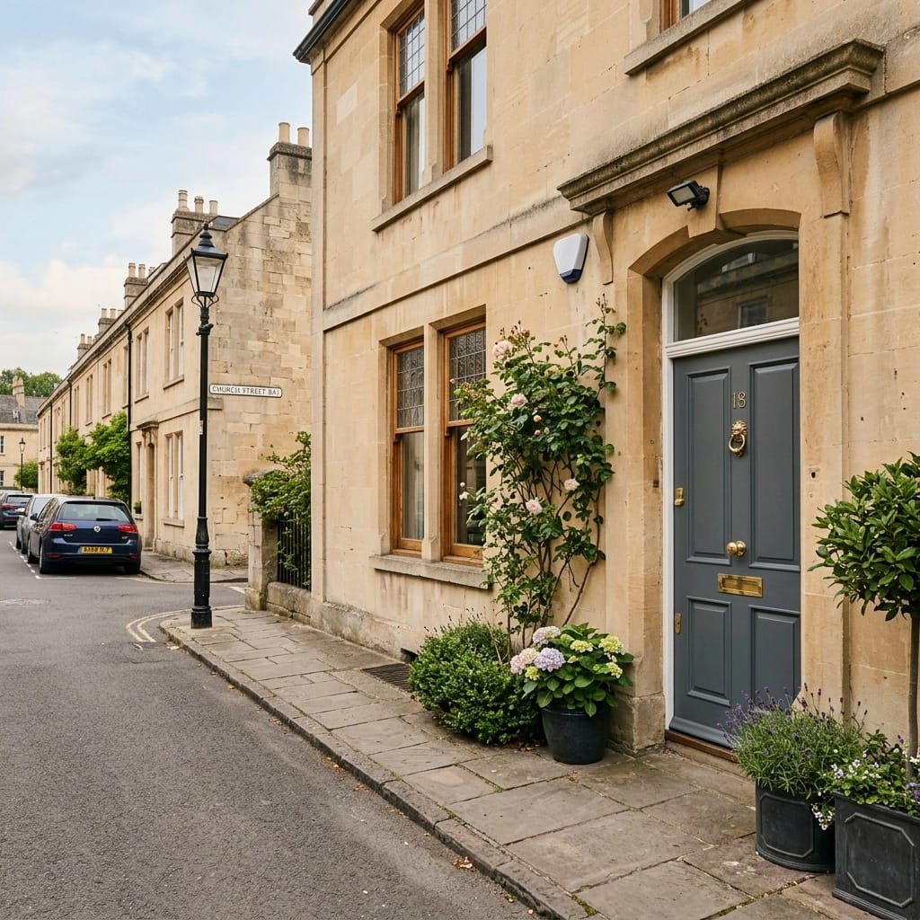 Quiet residential street in Bath with traditional stone houses representing community security.
